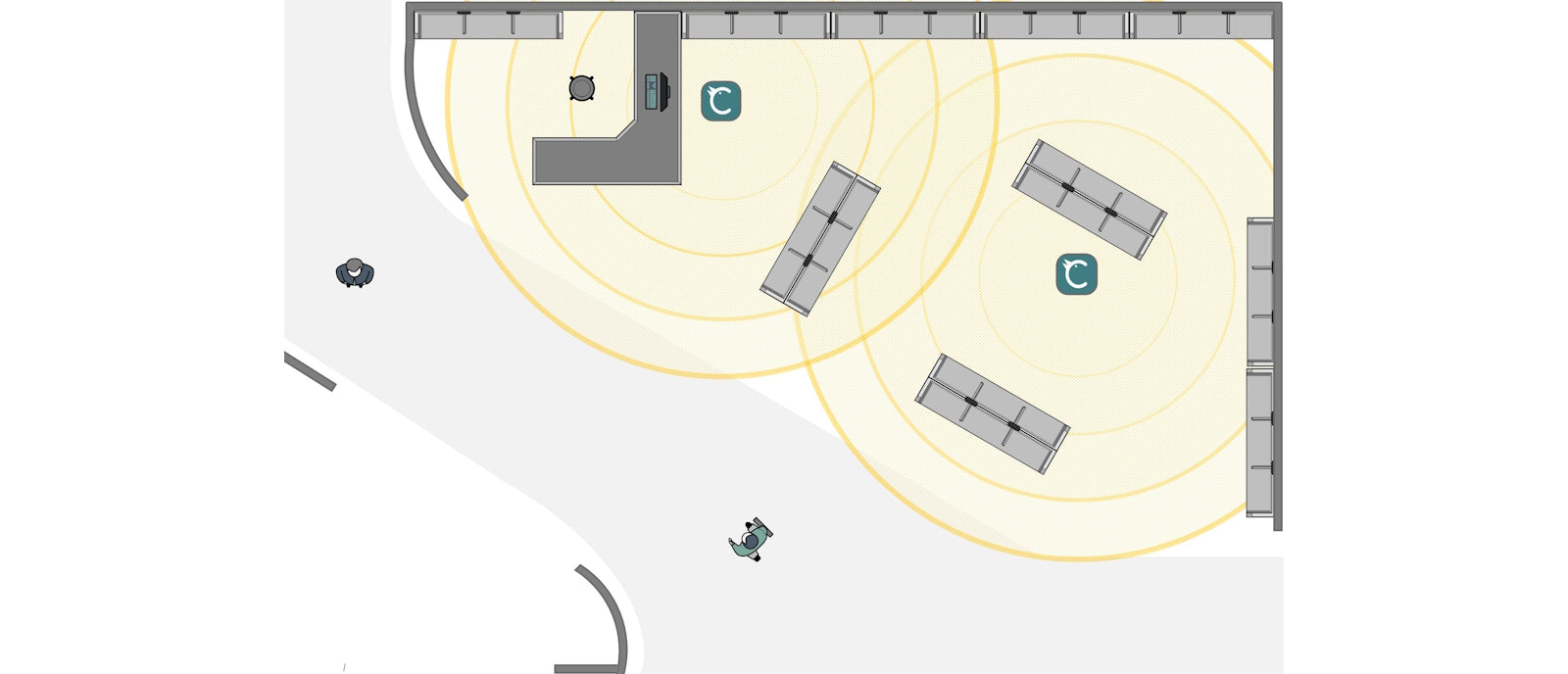 With our Chirp-zone system, a tagged product will alarm if taken too far away from the Hub, which can be ceiling-mounted close to the exits. Each Hub has a radius of up to 8 metres radius and you can add as many Hubs as you need to cover the whole space.