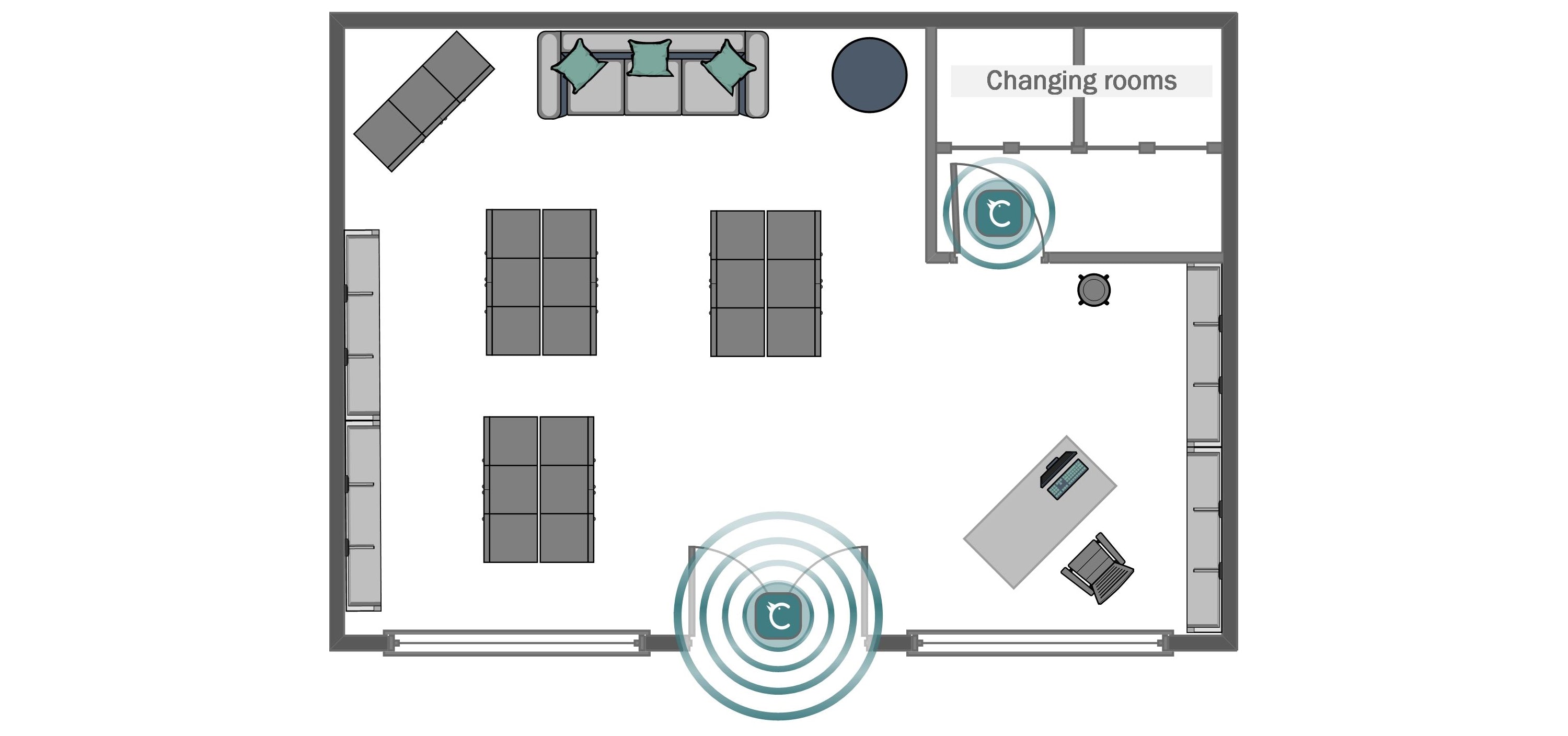 This is a reasonably straightforward setup - Helena simply requires 1x Chirp-edge Hub at the main exit and a second hub at the entrance to the changing rooms. She needs to protect 200 handbags and so purchases 8x packs of Lanyard Tags.