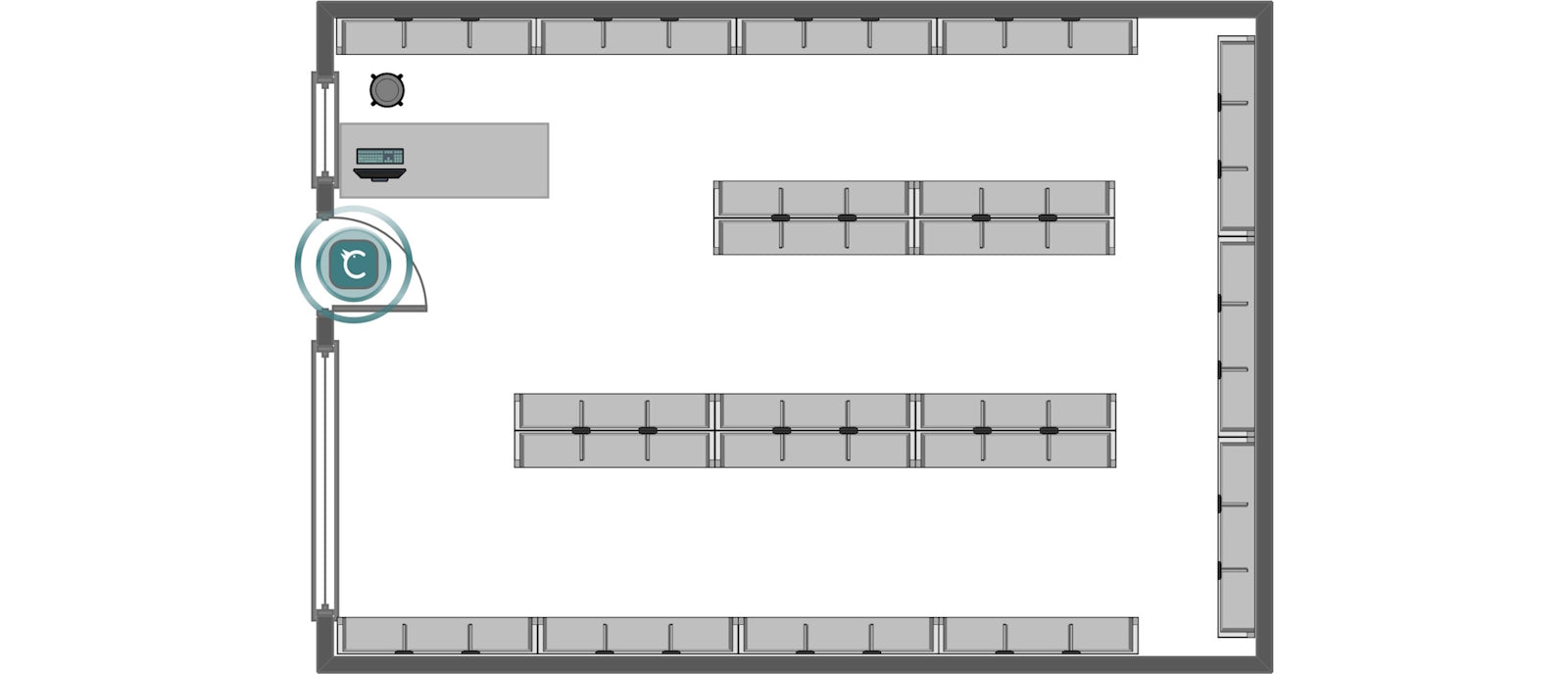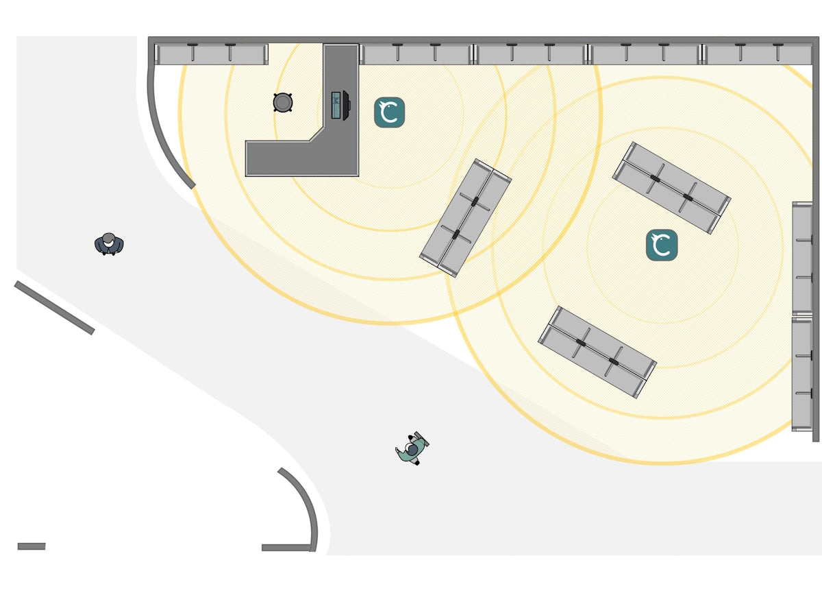 The image below shows how you would set up the 3 key components of the Chirp system in your store. Click each of the 3 dots to inspect each item.